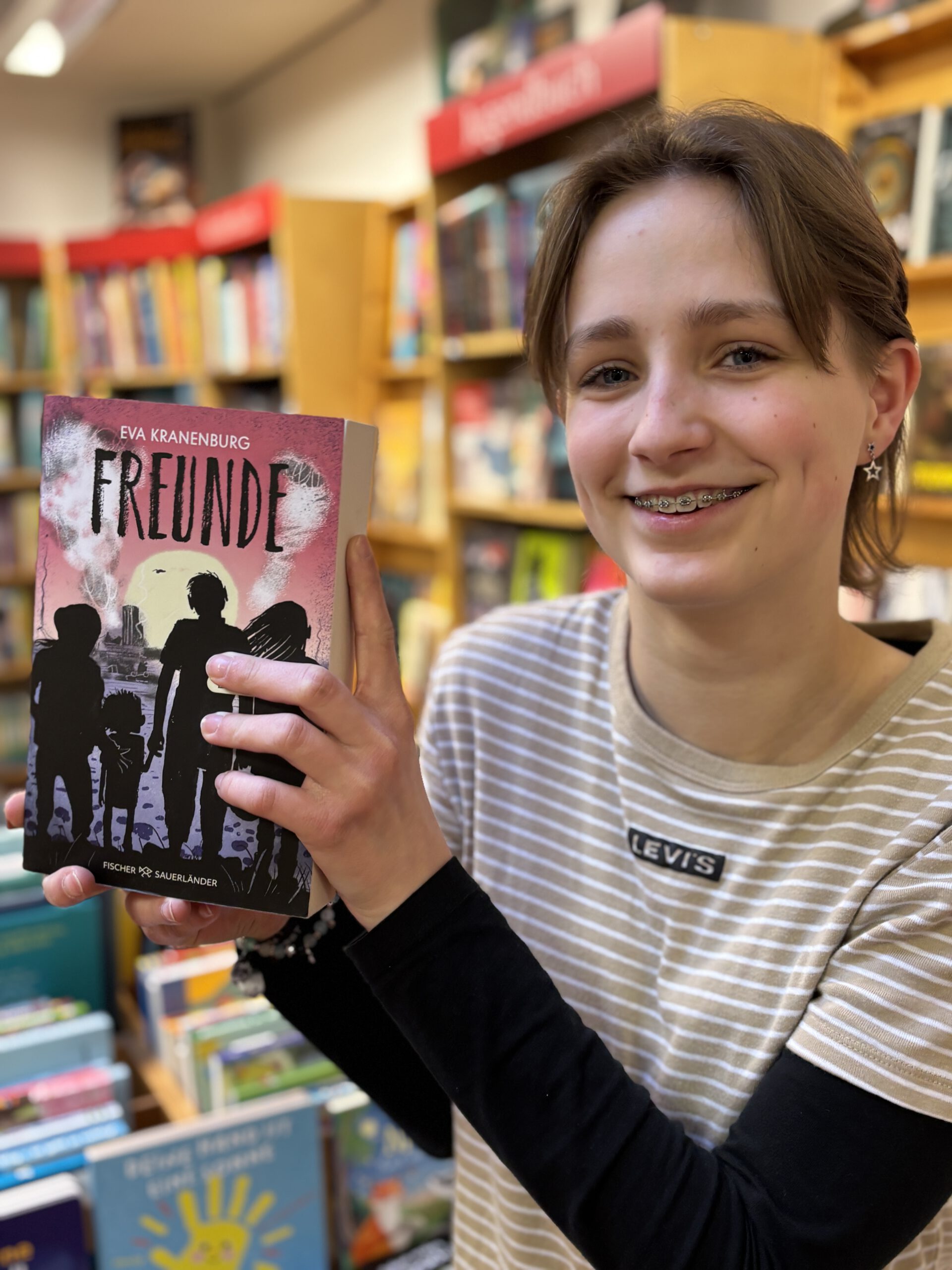 Feli, die Jüngste in unserem Team, möchte Euch ein gerade erschienenes Jugendbuch empfehlen: In dem Buch „FREUNDE“ von Eva Kranenburg geht es um den Jugendlichen Ren, der während eines Kriegs seine Familie verliert. Er muss Kriegsdienst leisten. Dabei lernt er Tarek, Tuk und Nata kennen. Auch sie sind Kriegswaisen. Durch diese anfängliche Zweckgemeinschaft werden sie langsam zu Freunden. Tarek ist Kommandant der Gruppe, die in den Krieg ziehen soll, aber er weigert sich zu kämpfen und die Jugendlichen desertieren. Trotz der scheinbar aussichtslosen Situation bleibt die Freundesgruppe menschlich und ist immer füreinander da. Der Roman ist nichts für schwache Nerven, da teilweise sehr ausführlich und detailliert zum Beispiel Kriegswunden beschrieben werden.